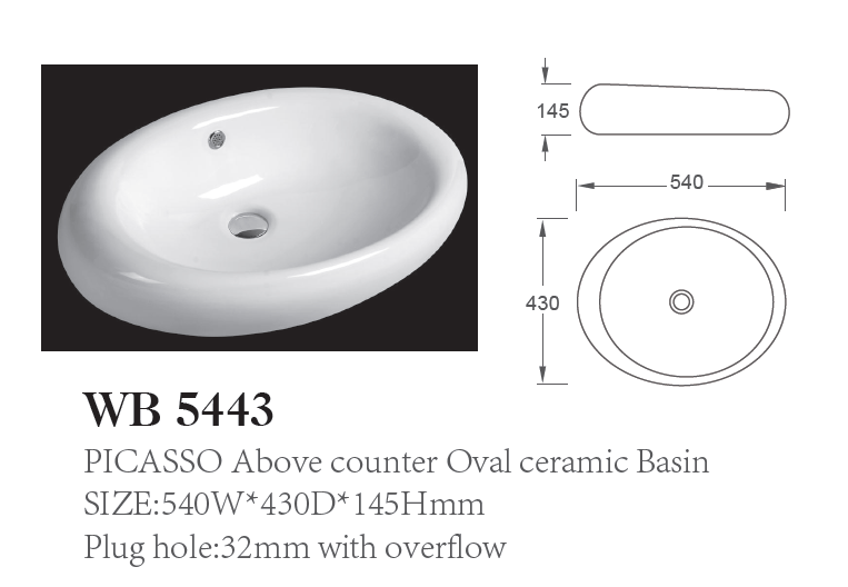 Oval Top Mount Basin 1 Tap Hole White 32mm O/F 540x430x145